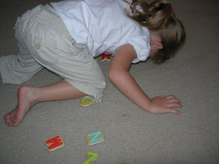 We will continue to work on this for a while. When I taught kindergarten, I had these great alphabet rainbows. One side had outlines of all of the letters, and the other side of the board had just a line in the shape of a rainbow. The students started on the outlined side and matched up letters to the letter shapes. Once the students could do this successfully in less than 2 minutes, they moved on to the rainbow line side. The goal was alphabet order in less than 2 minutes on that side too. I am going to have to look for one of these mats...they were excellent tools. If I can't find one, I will just have to make one!